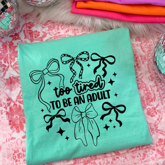 Too Tired To Be An Adult Single Color Bows White Transfer