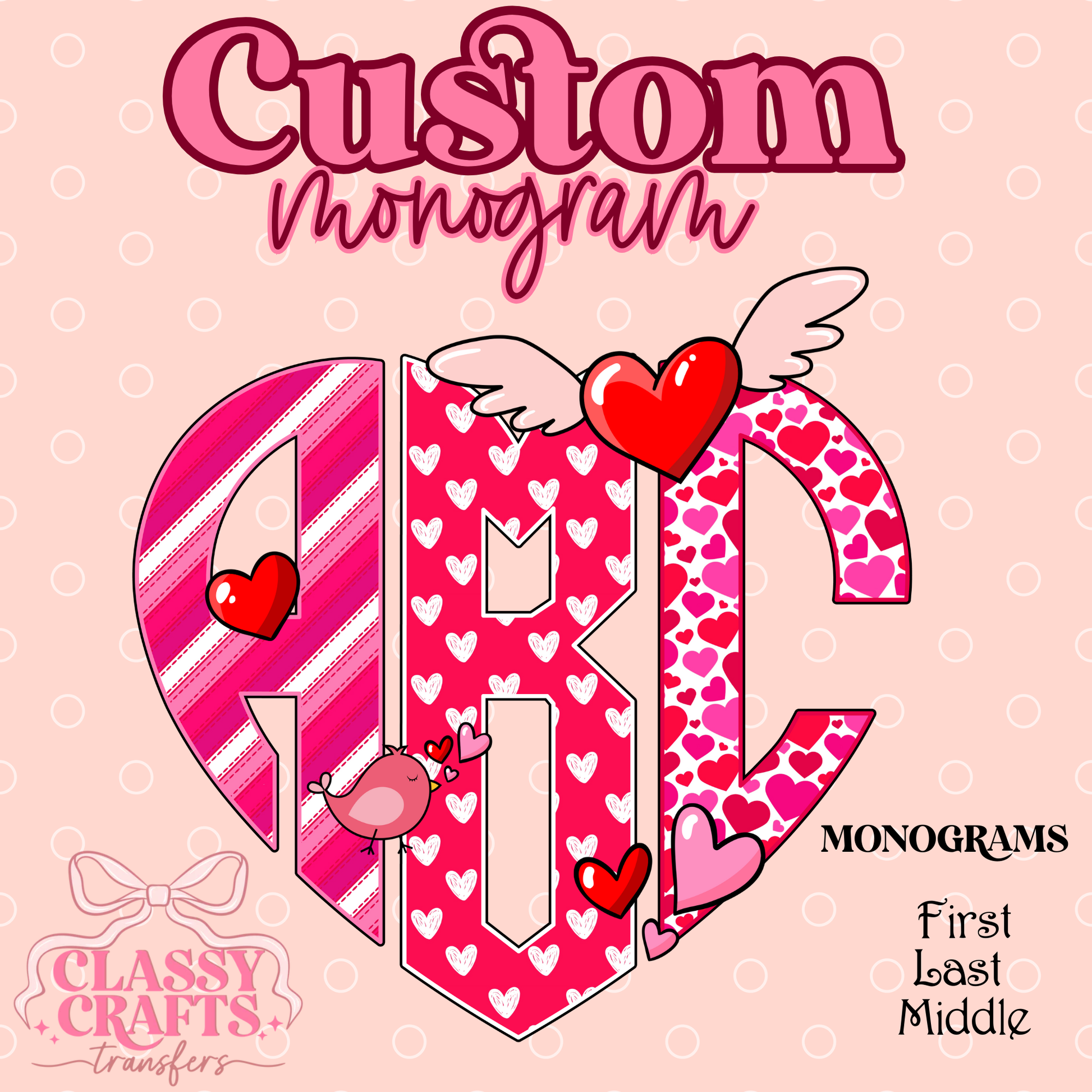 Pink & Red Strip Hearts- Custom Monogram Transfer