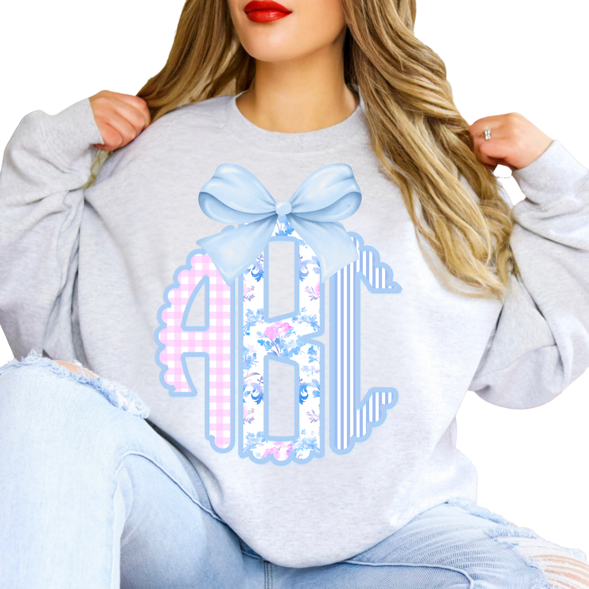 Pink & Blue Stripe Floral Coquette Bow - Custom Monogram Transfer